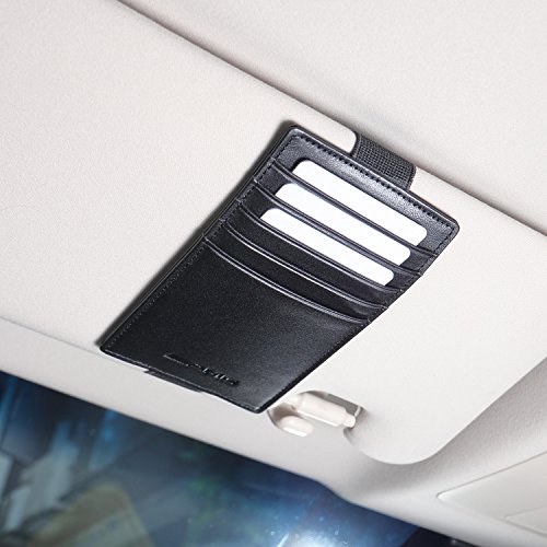 -. Feature : Material: 100% Italian full-grain calfskin / Product Size: 5.04 x 2.95 x 0.12 (inches) (12.8 x 7.5 x 0.3 cm) / Installed in the car sun visor by elastic band fastener, easy to use and install / Interior details: 5 card slots for parking card, driver's license, name card, credit card, notes etc / Black gift box with Tags