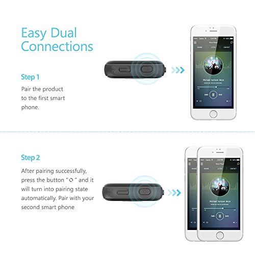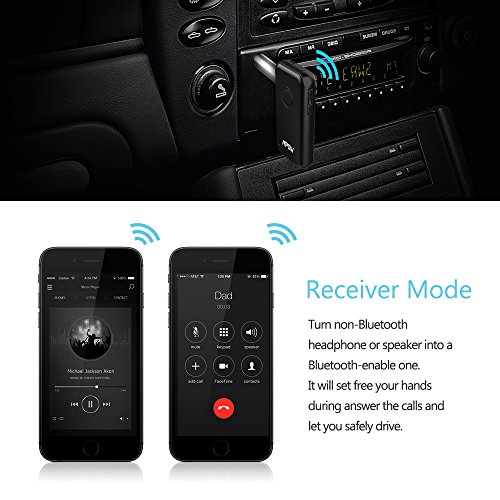 -. Feature : EASY DUAL CONNECTIONS: After pairing successfully to the first Bluetooth device, just short press the paring switch to turn into the second pair. The easy pairing operation makes it different from others. / HANDS-FREE CALLING: Simply pair your phone with the Bluetooth Adapter in receiver mode and its hands-free system can set free your hands during answer the calls and let you safely drive. / 2-IN-1 DESIGN: 2-in-1 Bluetooth adapter with 3.5mm jack, bridges your Bluetooth device to your non-Bluetooth speakers or your Bluetooth speakers to your non-Bluetooth audio device. Up to 12 hours working time in both modes. / ONE SWITCH BETWEEN TX AND RX MODE: TX Mode(Transmitter Mode): Pair the device to your Bluetooth headphones/Speakers, and then plug it in your non-Bluetooth media devices (such as MP3, TVs, etc.) via 3.5mm audio cable or RCA cable. Now you can enjoy your music from your non-Bluetooth media device! RX Mode(Receiver Mode): Connect the device to your non Bluetooth headphone/home speakers or car stereo system with 3.5mm audio cable, and then pair the receiver to your Bluetooth smart device. / BLUETOOTH 4.1: Get high quality audio sound than the Bluetooth 4.0 version both in playing music and answering calls. Up to 33ft connection range guarantees low signal delay.