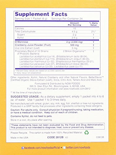-. Binding : Health and Beauty -. Brand : NOW -. Label : NOW -. Manufacturer : NOW -. PackageQuantity : 1 -. ProductGroup : Health and Beauty -. ProductTypeName : HEALTH_PERSONAL_CARE -. Publisher : NOW -. Studio : NOW -. Title : Cranberry Mannose + Probiotics - 24 Packets