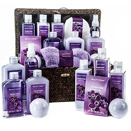 Our beautiful and refreshing Hawaiian Orchid Spa essentials includes a beautifully tailored weaved basket with a connecting lid. In this enormous spa basket is Liquid Hand Soap 8.2 fl oz, Hawaiian Orchid Hand Lotion 8.2 fl oz, Hawaiian Orchid Bubble Bath 8.2 fl oz, Bath Sponge, Wild Orchid Body Spray 8.2 fl oz, Hawaiian Orchid Bath Salts 3.5 oz, Hawaiian Orchid Shower Gel 8.8 fl oz, Hawaiian Orchid Body Lotion 8.8 fl oz, Hawaiian Bubble Bath 8.8 fl oz, 2 Hawaiian Orchid Bath Fizz 4.2 oz, and Purple Thermal Spa Socks. Substitutions of certain products may occur.