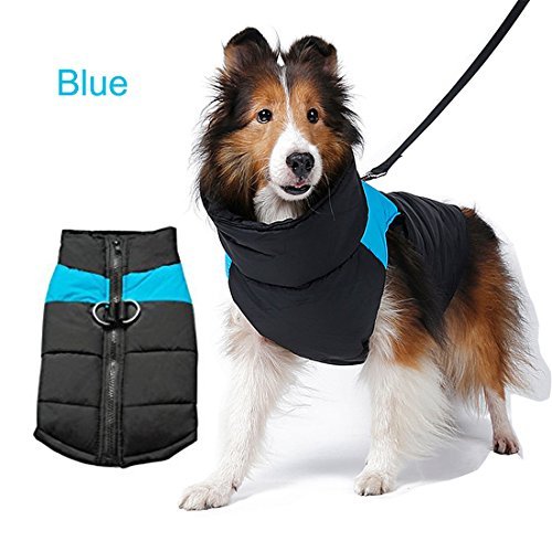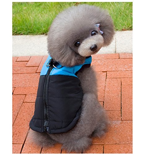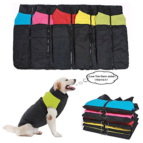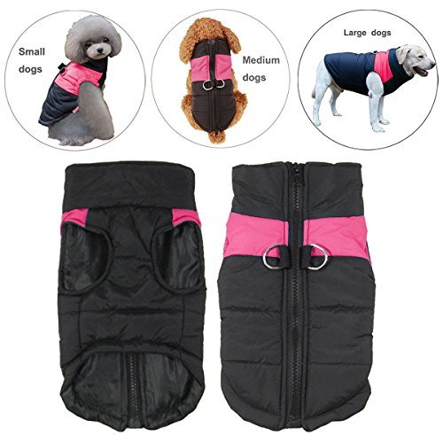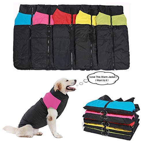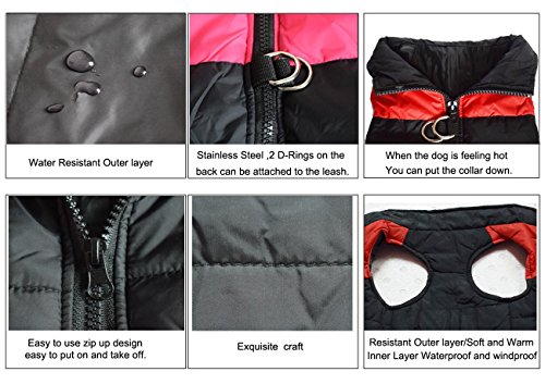 -. Feature : 1.LIGHTWEIGHT&WARM: Made of waterproof Polyester fiber outer layer, soft and warm inner cotton layer, windproof and snowproof. Let your dog enjoy playing outside. / 2.WATER RESISTANCE - No one wants to get wet during the cold weather, and this is why REENUO Padded Vest is water resistant. It helps your dog away from the wetness and keep your dog dry and warm when they play in the snow. / 3.ZIPPER CLOSURE - Zipper closure in the back creates an unique look as well as a secure fit. Safe guard prevents any furs to get stuck in a zipper. Your dog will looks very great in this warm padded jacket. The length of the belly part is shorter, and you don't need to worry that your dog will pee right into the vest. It's not a problem. / 4.100% Brand New and High Quality, Stainless steel 2 D-Rings attached on the back and it's Machine washable Two D-Rings on the back creates a harness function and gives an additional support when walking your dog / 5.Note: please take time to measure your dog/as carefully as there is no standard sizing chart for dogs. If any of the measurements are between to size, Please choose the larger size. (Please choose the proper size from the size chart in pictures.)