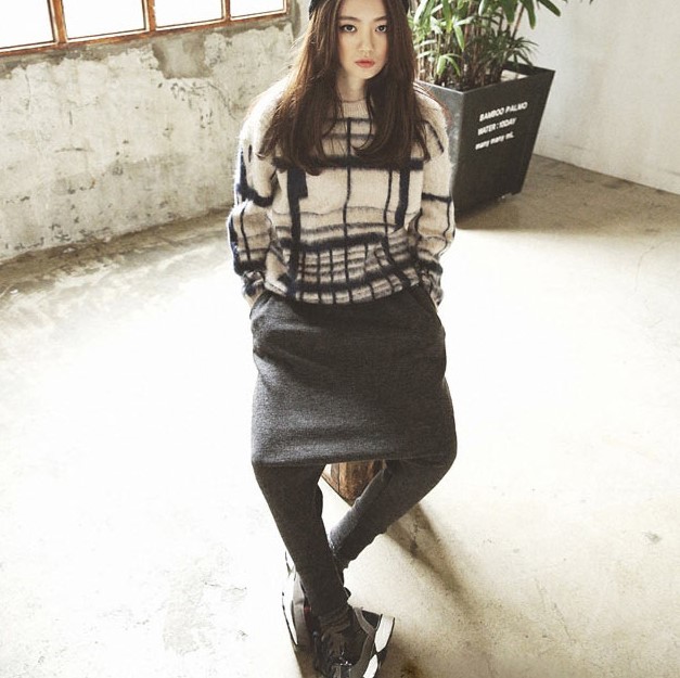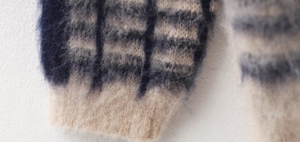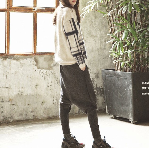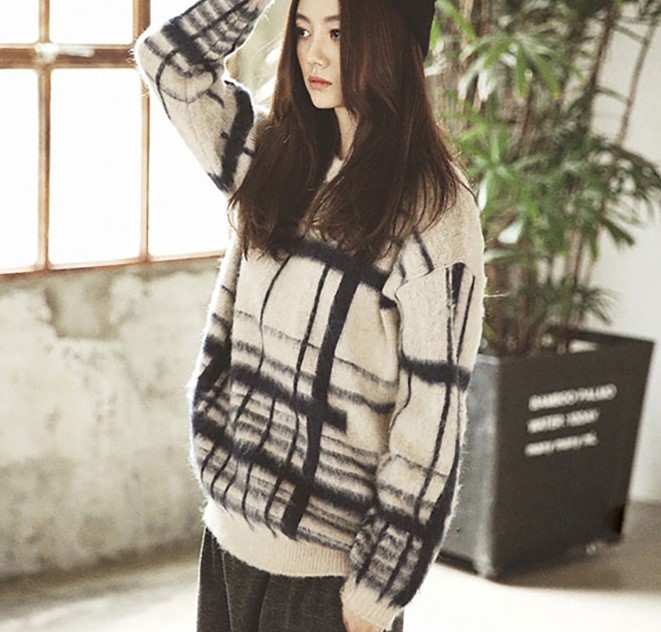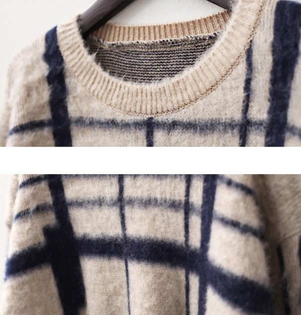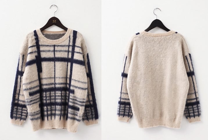 ランダムなチェック柄がオシャレなラウンドネックセーター。