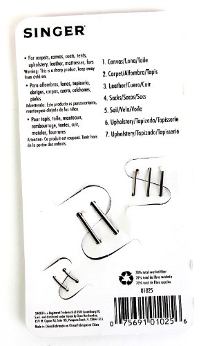 -. Feature : Assorted heavy duty needles. / Singer heavy duty assorted hand needles come in a variety of sizes and shapes for different uses around the house. / Use these hand needles on things like carpets, canvas, upholstery, coats, tents, mattresses, furs and leather. / Each pack comes with 7 assorted sizes and shapes.