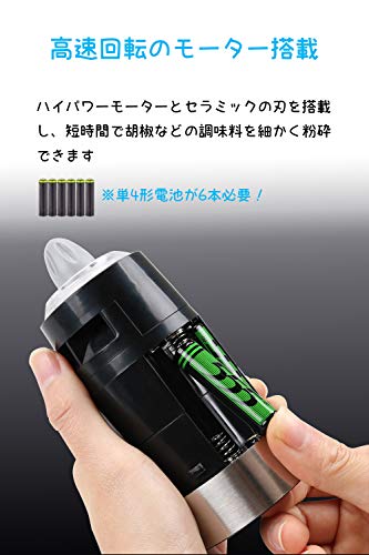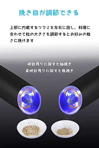 ★★★★★LED内蔵★★★★★ 高品質の青色LEDライトを3つ内蔵され、調味料を挽くとき、自動的に点灯します。 手元を照らす効果があり、料理を作る時の面白さを引き立てることもできます。 ★★★★★商品仕様★★★★★ ■サイズ:直径6.5cm×高さ20.1cm ■包装の寸法:幅7cm×高さ21cm×奥行7 ■ネット重量:305g ■グロス重量:387g ■電源:DC 9.0V(単4乾電池×6本※別売り) 同梱されたもの: 1 × ペッパーミル 1 × 取扱説明書(日本語・英語・ドイツ語) 1 × 掃除用ブラシ メーカー保証期間:ご購入日から1年間(xuhan-jpで注文した商品のみ) |