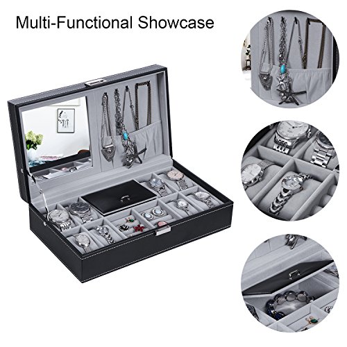 - WATCH & JEWELRY COMBO CASE: Stores up to 8 watches, plenty of room for rings and many other compartments/areas that you can store your jewelry. It comes with hooks and a pocket to store your necklaces so they don't get tangled. There is a small box in the middle of the watch storage areas that is good for storing bracelets, rings, cuff links, etc.