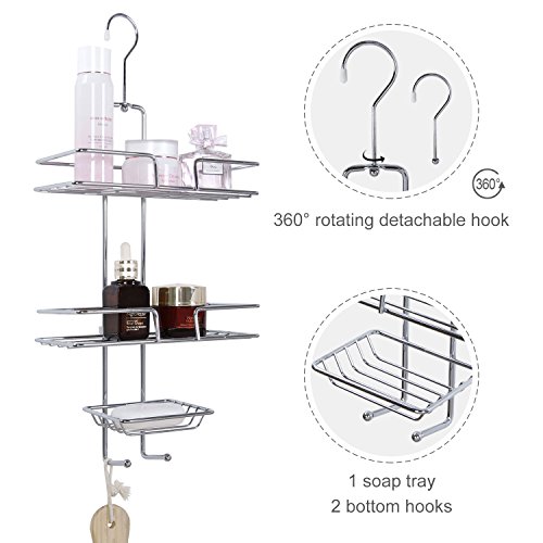 3 STORAGE SHELVES: The Shower Caddy features 2 wire baskets for storing shampoo, body wash, body lotion, and other shower necessities; 1 soap tray for placing soaps; and 2 bottom hooks for hanging towels and loofahs.
