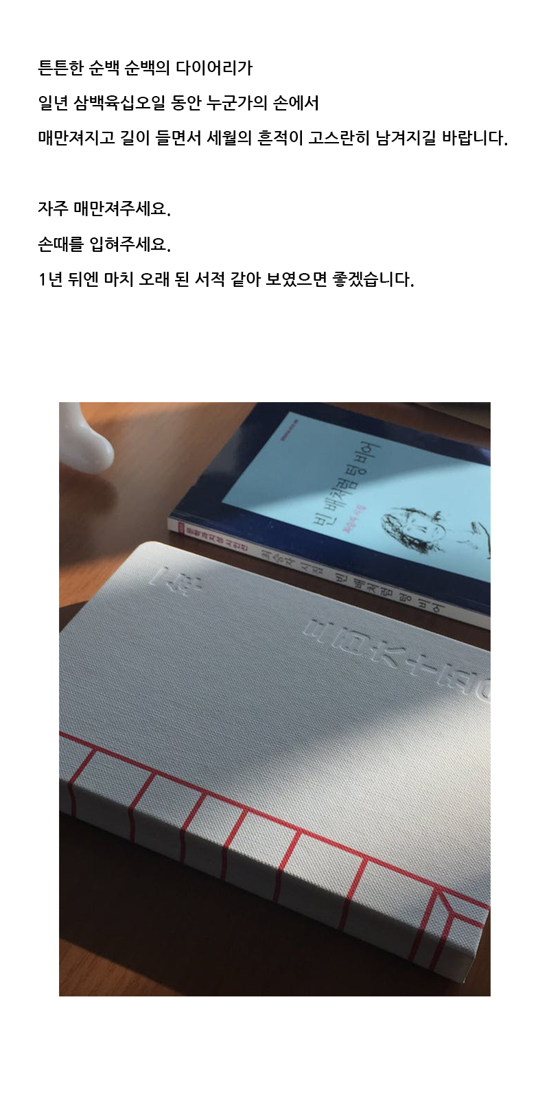 | 크기 : 128 x 182 mm 표지 : 하드 / 양장제본 / 패브릭 질감 일반 종이가 아닌 표지 특유의 질감이 있습니다. 단단한 하드 커버로 튼튼합니다. 내지 : 백상지 120g (일반 다이어리는 대부분 100g 사용) 제본 : 실제본 (뜯어짐 걱정 없고 180도 펼쳐집니다) 내지 구성 : 연간계획 / 12달 월간계획 / 64주 주간계획 / 줄지 32p / 모눈 20p / 무지 20p 책등과 연결된 라인은 오래된 서적의 제본 방식을 표현했습니다. 다이어리 표지로 잘 쓰이지 않는 화이트로 제작했습니다. 튼튼한 순백의 다이어리가 일년 삼백육십오일 동안 누군가의 손에서 매만져지고 길이 들면서 세월의 흔적이 고스란히 남겨지길 바랍니다. 자주 매만져주세요. 손때를 입혀주세요. 1년 뒤엔 마치 오래 된 서적 같아 보였으면 좋겠습니다. |