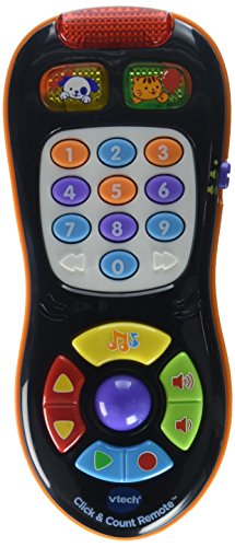 Choose a channel and learn with the click & Count remote from VTech. Your child can enjoy imitative fun while learning numbers, colors, and shapes with a TV remote control toy that looks just like mom and dad’s! this toy lets your child surf through nine different channels that include pretend news and weather for role-play fun. Volume and channel control buttons teach the concept of opposites. The music button and roller ball captures your child’s attention with sing-along songs, fun melodies, and sound effects. PLUS, familiar phrases like “breaking news” offer a playful real-life experience for fun imitative play.Feature