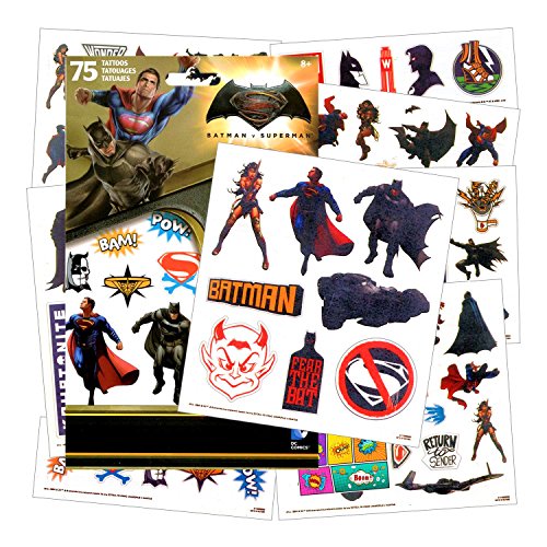-. Feature : Batman v Superman: Dawn of Justice Tattoos - 75 temporary tattoos! / Bag of 75 assorted temporary tattoos featuring the artwork and characters from the new Justice League movie; Batman v Superman. Tattoos include Batman, Superman, Wonder Woman, and more! / Temporary tattoos are easy to apply, easy to remove. Perfect for rewards, party favors, or just for fun! / Includes separately licensed sticker. Large reward sticker measures 3 x 3 inches. / Sure to be a hit with any Justice League fan! Perfect as party favors, rewards, and more!