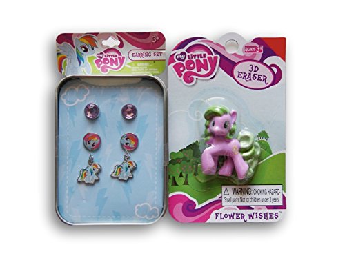 -. Binding : Toy -. Brand : MLP -. EAN : 0734463891324 -. Feature : My Little Pony gift set / Includes one 3D eraser (2.25'' tall) / Three pairs of earrings / One set of earrings features purple ''gems,'' one set features Rainbow Dash cameos, and one set features dangling Rainbow Dash charms / Earrings come with a reusable tin (3'' x 4.5'' x 1'') with Rainbow Dash on the lid -. IsAdultProduct : 0 -. Label : SkyHigh -. Manufacturer : SkyHigh -. ProductGroup : Toy -. ProductTypeName : TOYS_AND_GAMES -. Publisher : SkyHigh -. Studio : SkyHigh -. Title : My Little Pony Accessory Gift Set - Rainbow Dash Earrings and 3D Eraser -. UPC : 734463891324