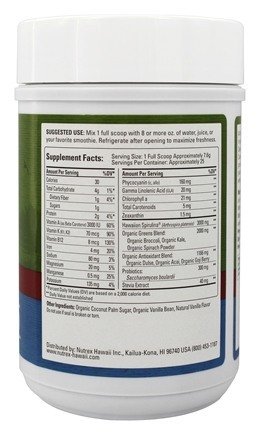 Green Complete Superfood is powered by all natural Hawaiian Spirulina. It provides a major energy and immunity boost by supplying: One full 3 gram serving of Hawaiian Spirulina; Organic greens (Broccoli, Kale & Spinach); Organic antioxidants (Dulse, Acai, Goji Berry); Probiotics (Saccharomyces boulardii); & Natural Vanilla Bean Flavor