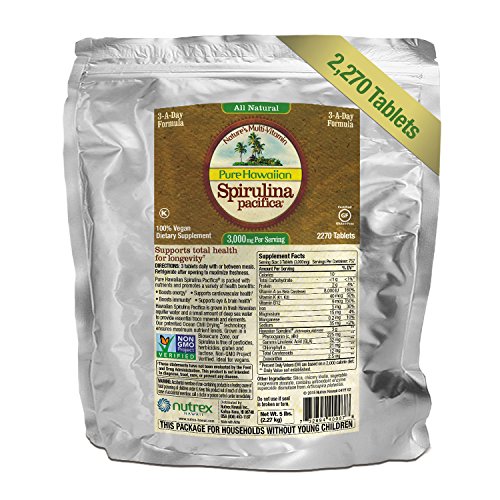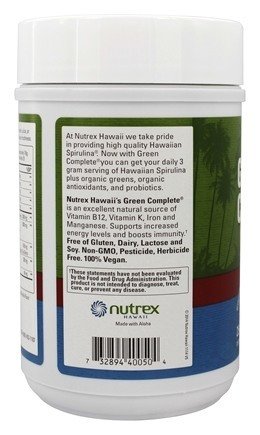 Hawaiian Spirulina is a blue-green microalgae, Arthrospira platenesis, which is grown naturally under the intense Hawaiian sun on the Big Island of Hawaii. It naturally contains protein, iron, beta carotene, minerals, vitamin B12, zeaxanthin, chlorophyll, and phycocyanin. One 3 gram serving has higher levels of some key antioxidants, enzymes, and minerals compared to 5 servings of fruits and vegetables. Ideal for vegans. · Nutrex Hawaii, founded in 1999, is the leading producer of natural microalgae supplements from Hawaii. Farm to Bottle, we control the cultivation, harvest and processing of our Hawaiian Spirulina and BioAstin Hawaiian Astaxanthin microalgae products. We are GMP (Good Manufacturing Practices) third-party certified. All of our products are pesticide and herbicide free, non-GMO, free of gluten, soy, lactose, and preservatives.Feature