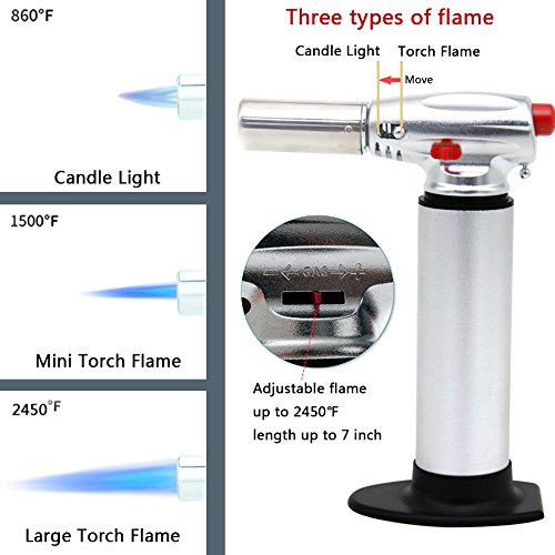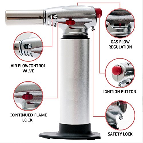 ADJUSTABLE TEMPERATURE REGULATOR:Easily adjustable continuous flame/highly dependable piezo ignition.Gas Flow Regulator dial of this kitchen torch easily adjusts for a continuous flame on of up to 6 inches and temperature of 2370°F/1300°C . Industry standard Piezo press button ignition provides reliable and immediate lighting of the torch.