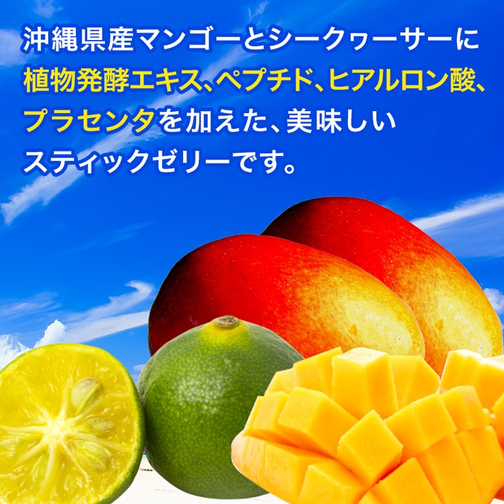 ガラクトオリゴ糖液糖、マンゴー(沖縄県産)、シークヮーサー(沖縄県産)、寒天、グルコマンナン、植物発酵エキス末(デキストリン、てんさい糖、黒砂糖、オリゴ糖、麦芽糖、ヨモギ、ウコン、ドクダミ、キダチアロエ、高麗人参、センシンレン、ウメ、オトギリソウ、クマザサ、タンポポの根、霊芝、アマチャヅル、トチュウ葉、オオバコ、カンゾウ、マツ葉、ナンテンの葉、アマドコロ、ツユ草、ツルナ、マカ、トンカットアリ、ハブソウ、ハト麦、スギナ、ビワ葉、ラカンカ、クコの実、レンセンソウ、モモの葉、イチョウ葉、ニンドウ、イチジクの葉、ベニバナ、エゾウコギ、エンメイソウ、モロヘイヤ、セッコツボク、アカメガシワ、クコ葉、カキの葉、カミツレ、カリン、シソ葉、桑葉、メグスリの木、田七人参、ナツメ、キキョウ根、サラシア、マタタビ、キンカン、イチジク、ミカン、パインアップル、リンゴ、グレープ、メロン、レモン、グレープフルーツ、アンズ、トウガラシ、ショウガ、シイタケ、ニンジン、タマネギ、パセリ、キャベツ、ゴボウ、モヤシ、ニンニク、コンブ、フノリ、エビス草の種子、紅参、アガリクス、ルイボス、アムラの実、キャッツクロー、タマネギ外皮、柿、キウイフルーツ、グァバ、梨、パッションフルーツ、バナナ、パパイヤ、ブラックベリー、ブルーベリー、プルーン、マンゴー、モモ、柚子、アスパラガス、インゲン豆、カボチャ、キュウリ、キクラゲ、ゴーヤ、ココア、小松菜、スイートコーン、せり、セロリ、大根、大豆、チンゲン菜、トマト、なすび、ニラ、ピーマン、ブロッコリー、ほうれん草、抹茶、ミツバ、ミョウガ、舞茸、レンコン、ワカメ、根昆布、ヒジキ)、豚エラスチンペプチド、ヒアルロン酸、豚プラセンタエキス、植物性乳酸菌(殺菌)、デキストリン/乳酸カルシウム、pH調整剤、香料、(一部にリンゴ・大豆・キウイフルーツ・バナナ・モモ・豚肉を含む) |