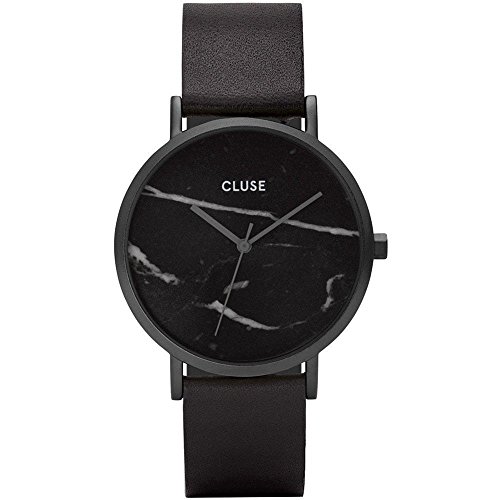 Designed as a tribute to one's uniqueness, this CLUSE La Roche watch features a genuine black marble dial, produced from a raw stone. Every piece of marble is one of a kind with a natural veining pattern, which makes each La Roche timepiece entirely unique. Loyal to our minimal aesthetic, this collection features a 38 mm stainless steel case with a matte black finish and a black leather strap for a bold and stylish look.Feature