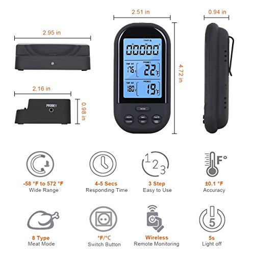The large screen LCD display with a blue backlight provides you comfort and ease to easily determine meat temperature and switch different settings. Temperature display options for both Celsius and Fahrenheit