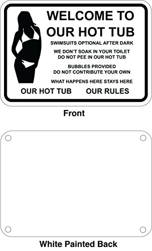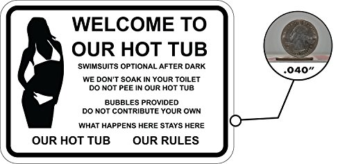 WELCOME TO OUR HOT TUB - Funny aluminum sign. Clothing optional. No peeing or bubble contributions. What happens in the tub, stays in the tub. 7"x10" Great for tubs, spas, pools or jacuzzis