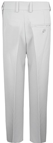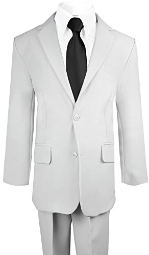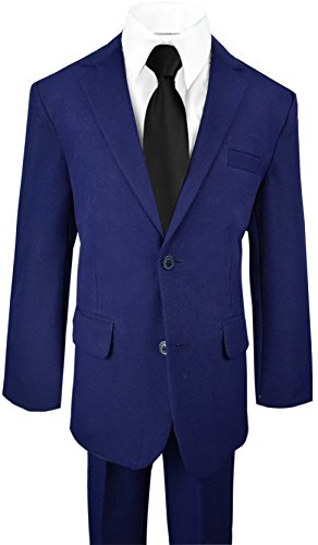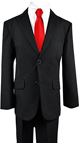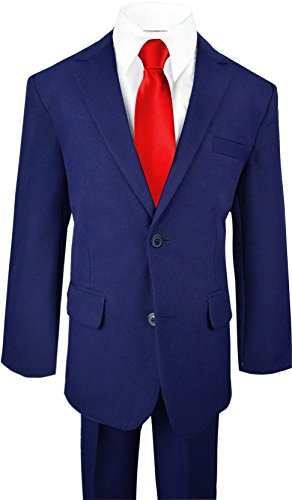 This handsome boys solid suit and tie includes a jacket, vest, tie shirt and pants. Made with 100% polyester this suit will surely impress. Perfect for ring bearers and any special wedding events. Please check our image size chart for the best fit.