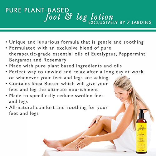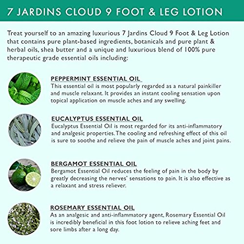 Are You Looking for Ultimate Foot Relaxation Experience to Help You Unwind? 7 Jardins Cloud 9 Foot and Leg Lotion is made up of a combination of plant based ingredients, botanicals, herbal oils, shea butter and mixed with therapeutic grade essential oils to create a powerful aromatherapy foot and leg lotion. You'll get luxurious foot spa quality experience at home. Here is What Makes 7 Jardins Cloud 9 Foot and Leg Lotion So Amazing - Premium Formulation - The combination of pure plant based ingredients, shea butter, botanicals and herbal oils is combined to dissolve easily into water to help soothe muscles aches in the feet and legs and helps reduce swelling. Leaving your feet feeling refreshed, rejuvenated and helps put your mind at ease. - Excellent Quality Essential Oils - Each ingredient is carefully chosen for their relaxing and soothing properties to enhance relaxation experience. These include Eucalyptus, Peppermint, Bergamot and Rosemary. - Free of Harsh Chemicals - Doesn't contain petroleum, parabens, formaldehyde, synthetics, parfum and artificial colors. Our leg and foot lotion is wheat free, nut free and sulfate free. - Here at 7 Jardins we're ?committed to providing the best quality customer service. We're so confident that you'll love our Sensual Uplifting Bath Salt. CLICK ADD TO CART NOW to Give Yourself a Foot Bath Relaxation From the Comfort of Your Own Home. DISCLAIMER: The Statements of this Product have not been evaluated by the FDA (U.S. Food Drug Administration). Our Products are for Wellness Purpose, so these products are neither medicines, nor cure, diagnose or prevent from any disease. The Results of these products may also vary from person to person. 0 |