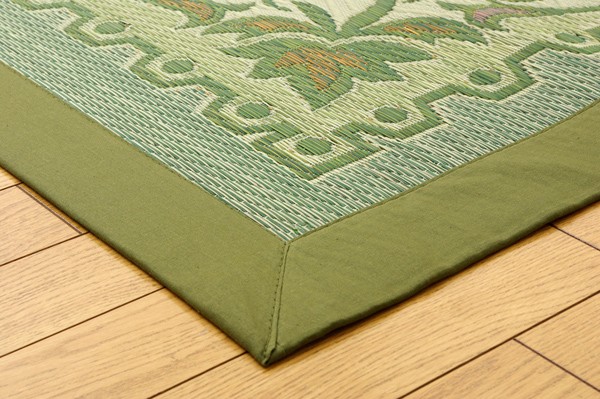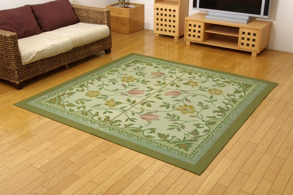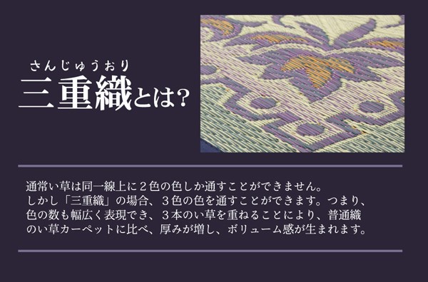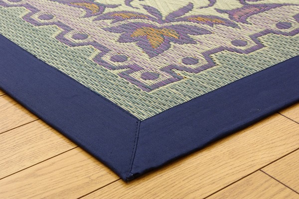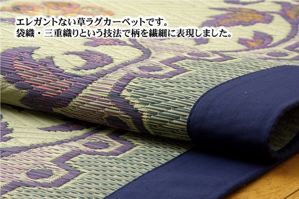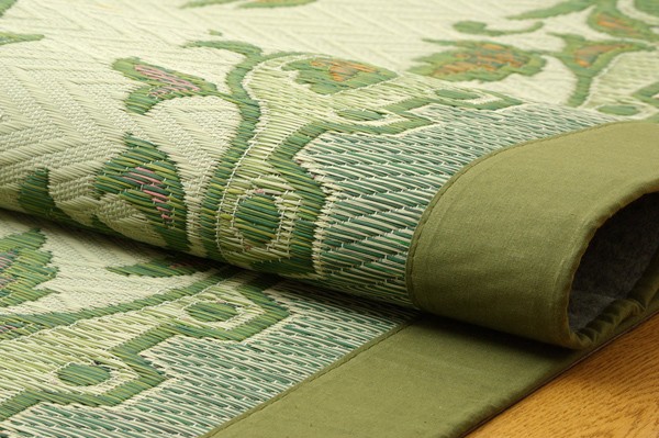 エレガンスな花柄のい草カーペットです。袋織りという技法で繊細な柄を出しています。折れ曲がりが複雑なので、長いイ草を使用しないと切れてしまいます。縦糸が密なので、しっかりとしていて破れにくいのが特徴です。普通織の場合同一線上に2本のい草を通しますが、こちらの商品は3本のい草を通しています。よりボリューム感があり、耐久性があるのと、同一線上に3色の色が出せますので、より鮮やかで繊細な柄を出すことが出来ます。い草には空気の自然浄化作用、湿度の調節作用などがあります。また汚れにくく、使用するうちに黄金色に変化し味が出ます。フローリングを傷つけにくいよう、裏には不織布を貼っています。い草に青森ヒバ加工を施しています。(抗菌、防臭効果)