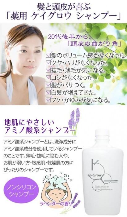 | 年齢を重ねるごとにダメージが増えるのはお肌だけではありません。ケイグロウ頭皮シャンプーは健康な髪の方にも、髪の悩みをお持ちの方にも使って頂きたい薬用シャンプーです。頭皮を健康に保つノンシリコンで、男女兼用・お子様も使っていただけるお肌に優しいシャンプーです。3つのうるおい成分「コンフリー・ラクトフェリン・パントテニルアルコール」を配合しております。お得な大容量だから家族みんなでもご使用頂けます。 |