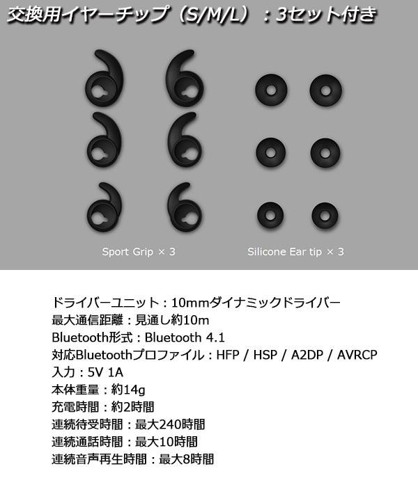 | 付属品 | 交換用イヤーチップ×3セット(S・M・L)※うち1セットは本体装着済み、充電用microUSBケーブル、取扱説明書、保証書(保証期間:1年間) |