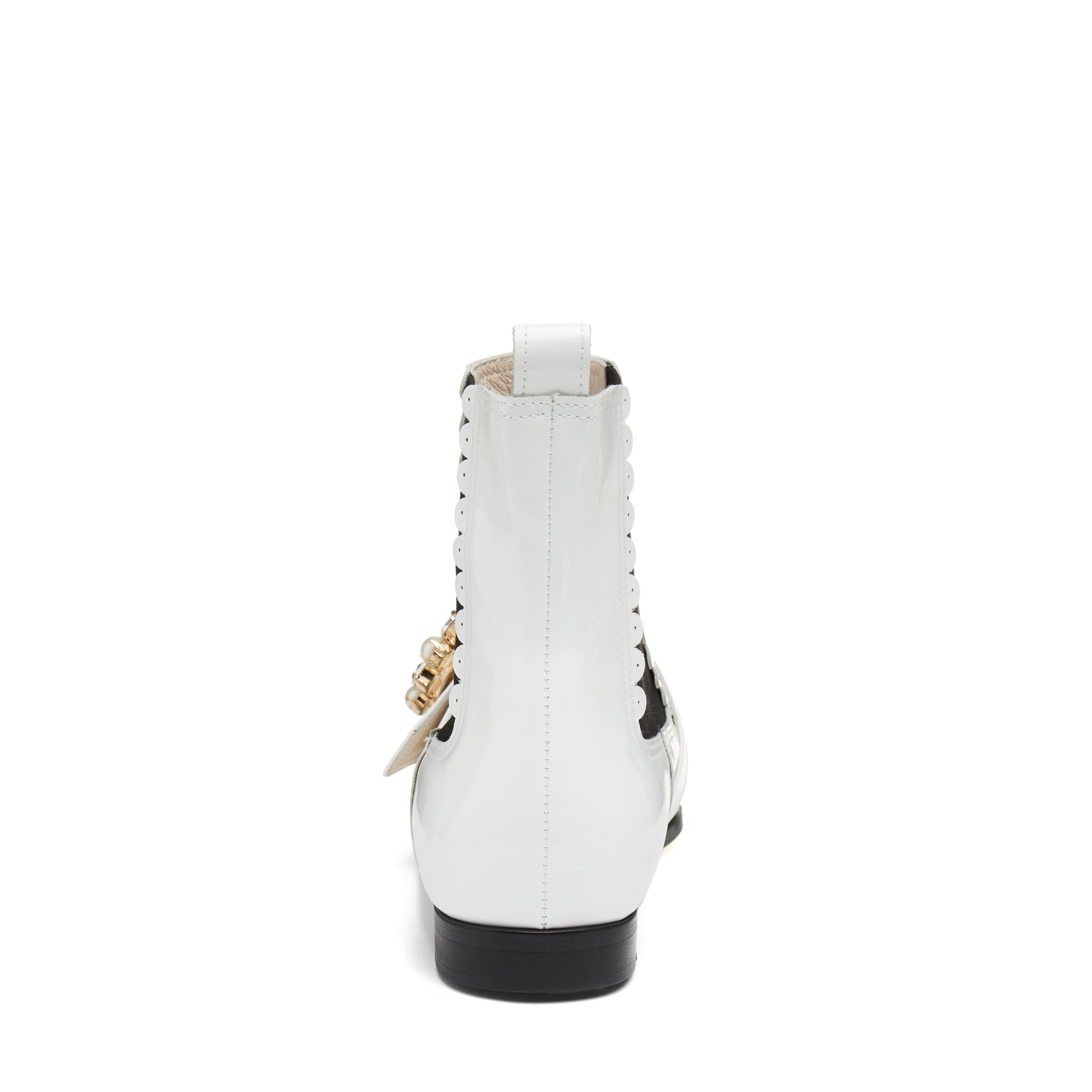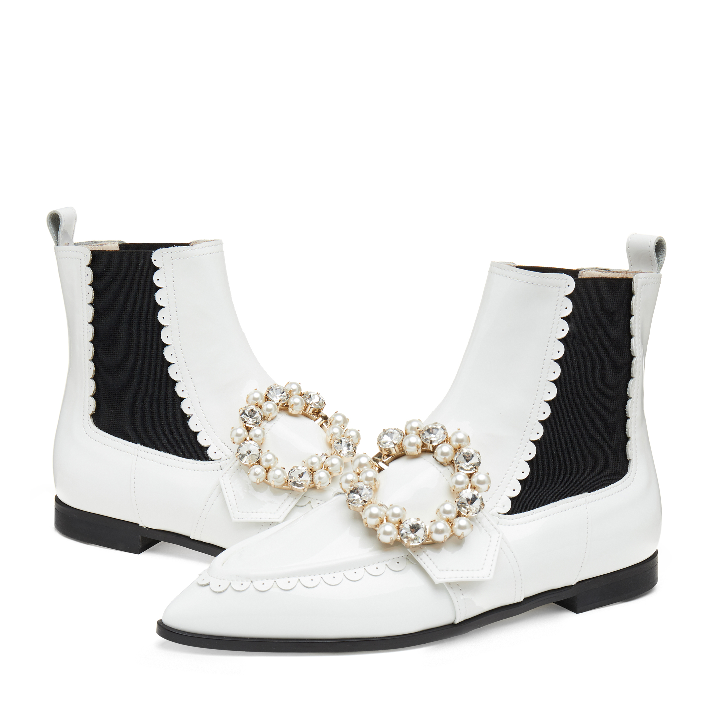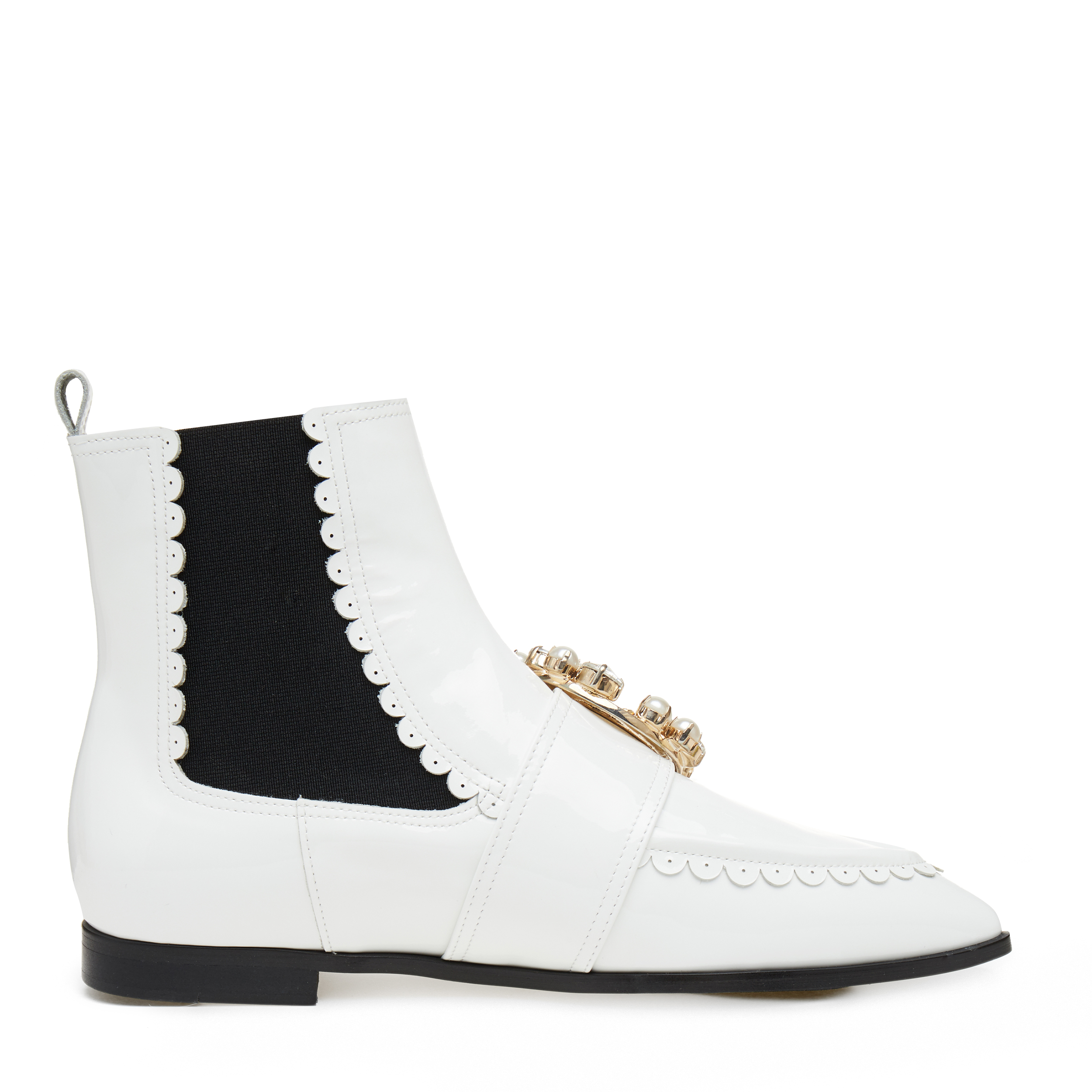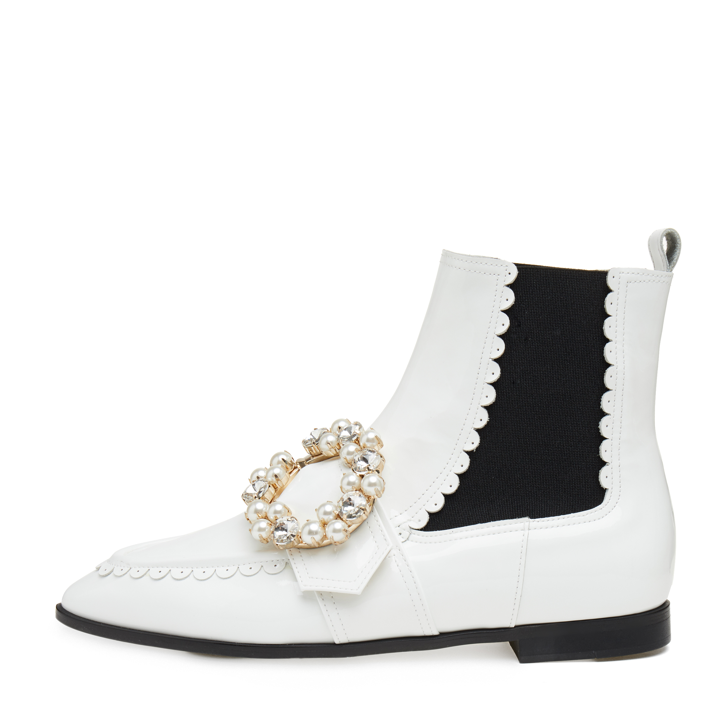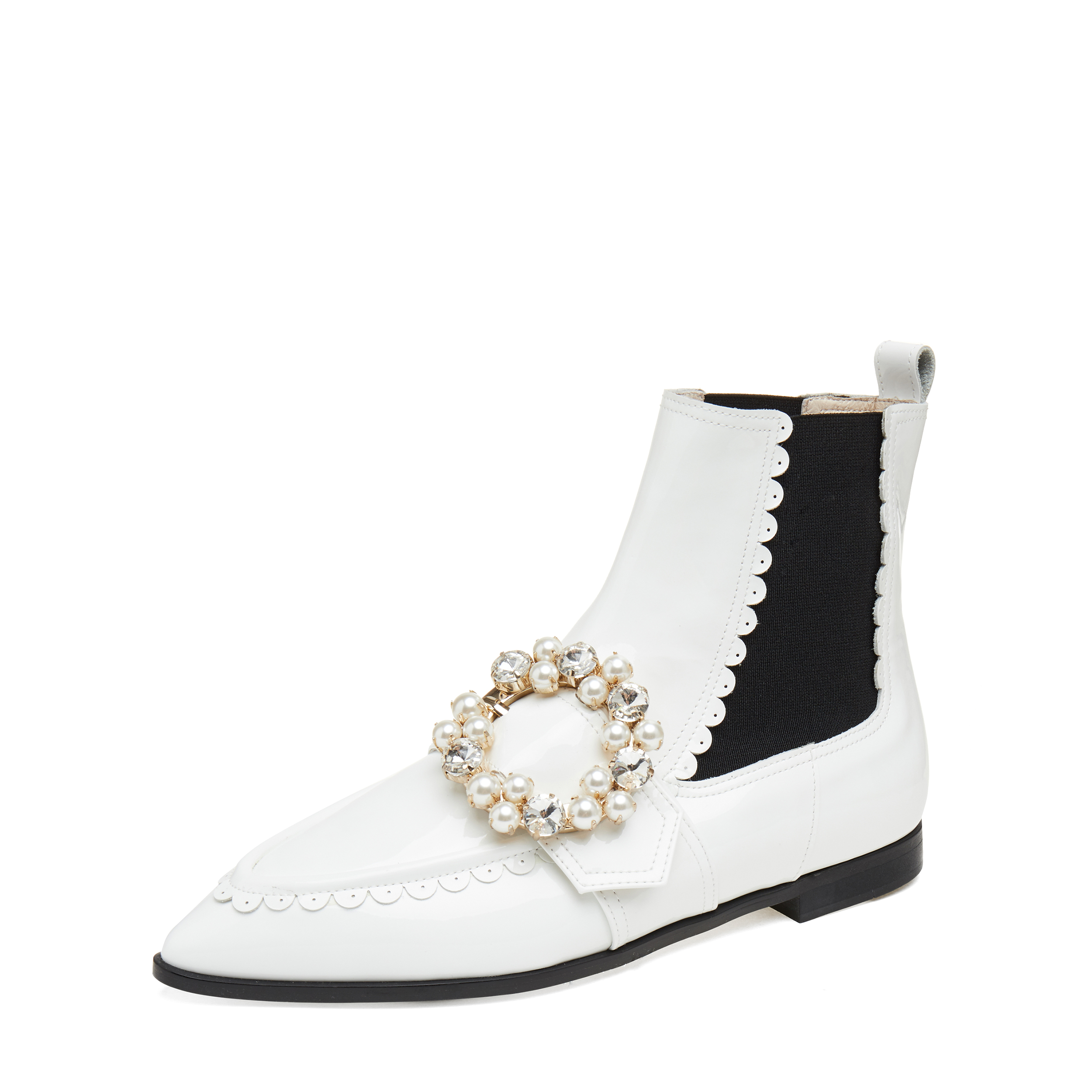 - 반원모양의 케이 디테일과 보석장식의 오링이 포인트인 첼시부츠.
