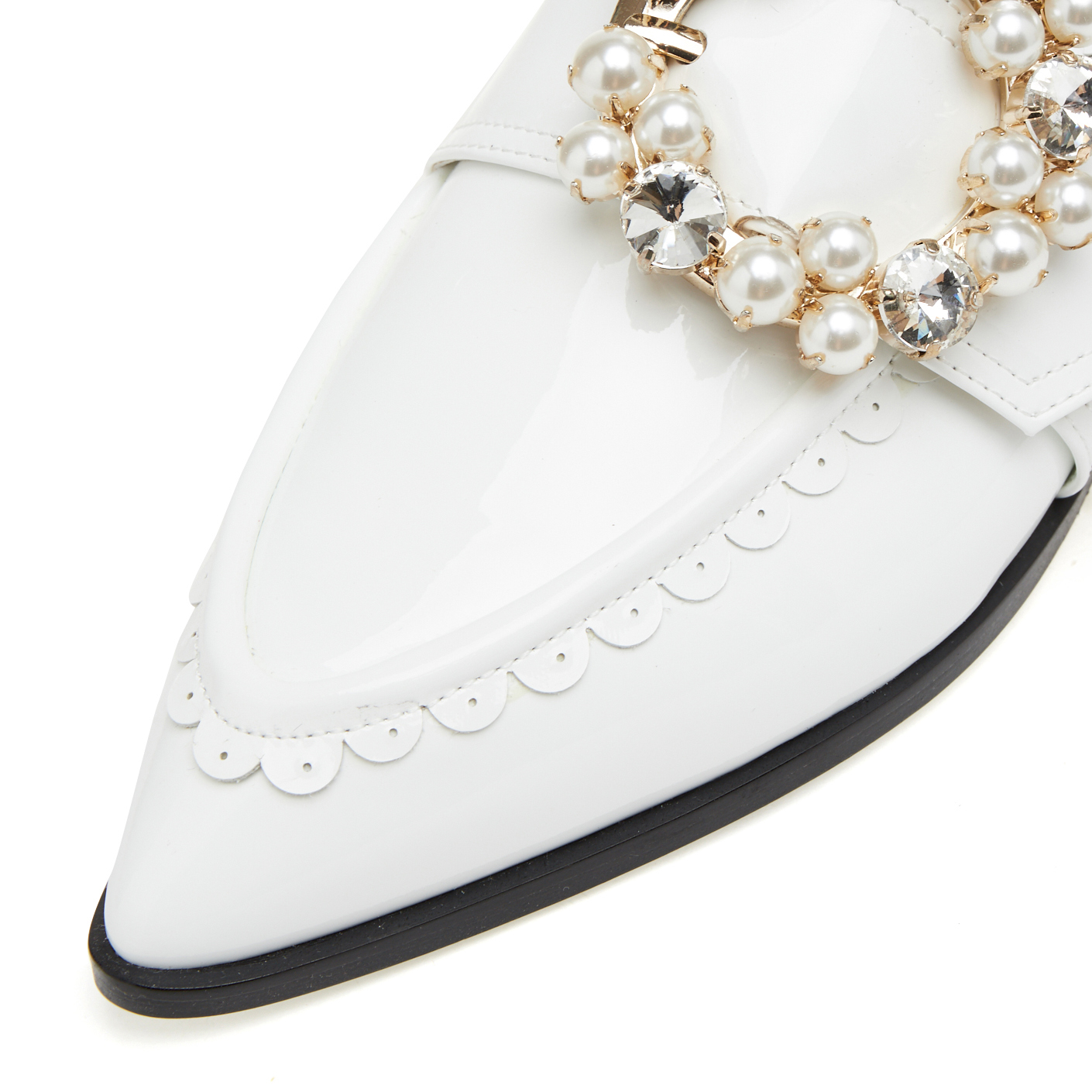 - 화이트의 크링크 가죽과 포인티드 토 디자인으로 시크한 무드 연출.