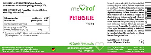 Petersilie 400 mg besticht durch innovative Verarbeitung, welche es Ihnen erlaubt, das volle Potenzial der Petersilie auszuschöpfen. Die Mineralstoffe Kalium, Eisen, Mangan und Zink, eine Fülle an Vitaminen und sekundären Pflanzenstoffen sowie die ätherischen Öle Myristicin und Apiol bündeln das Beste der Petersilie in unser bioverfügbaren Formel. So fördert Petersilie 400 mg nicht nur den gesamten Blutlauf in seiner Funktion, sondern unterstützt den Harntrieb auf natürlichste Art und Weise. Somit sorgt Petersilie 400 mg für eine regelrechte Spülung des Körpers. Schenken Sie sich Petersilie 400 mg von McVital - Das Beste eines altbewährten Wunderkrautes.