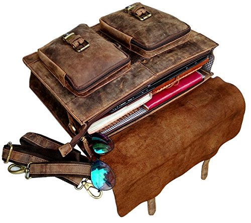 -. Feature : 2 big front pockets to carry cellphones/ wallets / small books etc / Designed by VINTAGE COUTURE Can be used as a laptop bag , leather messenger bag , leather briefcase , courier bag / Size: 15.5 "x 11" x 4" , Big pocket to accommodate Ipad's files etc. Cards / phones and pen section inside , 1 external metal zipper for convenience / Rustic Vintage look , concealed snap closures for easy access , adjustable shoulder strap / Made from the finest Hunter buffalo leather and lined with high quality canvas this bag is hand crafted by artisans working with leather for decades / Padded compartment for Laptop's ( fits upto 15" laptop / Macbook )