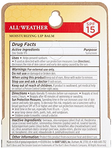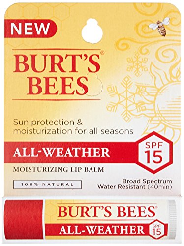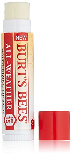 Burt's Bees All-Weather SPF15 Moisturizing Lip Balm protects and nourishes your lips all year long. Infused with Zinc Oxide, this natural broad spectrum SPF15 lip balm provides sunscreen benefits without the typical whitening appearance and leaves your lips richly moisturized and soft. Rain or shine, Burt's Bees All-Weather SPF15 will make your lips juicy, happy and feeling healthy in a matte finish and is water resistant (40 minutes). This tint free tube of soothing All-Weather SPF15 Lip Balm glides on smoothly with moisturizing balm texture to nourish dry lips while keeping them protected and hydrated. Conveniently tuck this tube into a pocket or purse, so that you can keep natural, nurturing lip care handy. This 100% natural beauty product is formulated without parabens, phthalates, petrolatum and SLS and will beautify and revitalize your lips. Use this natural Burt's Bees Moisturizing Lip Balm to make lips feel their best.Feature