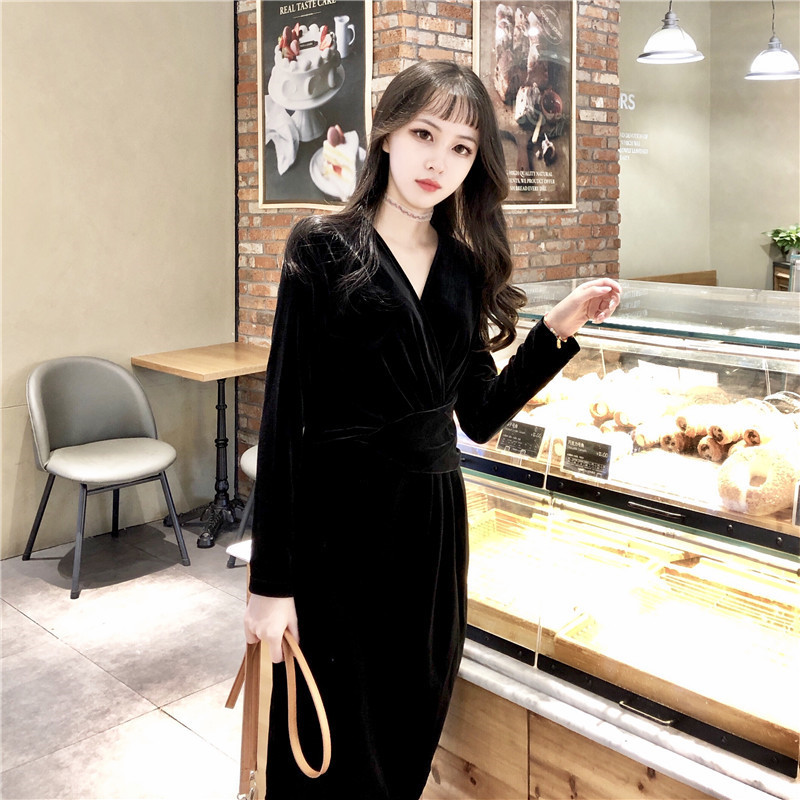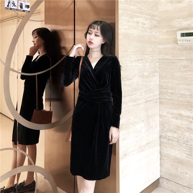 大人シック Vネック シンプル 膝丈 黒 ワンピースドレス ミディ丈 長袖 スエード ガウン エレガント きれいめ お呼ばれ 秋冬