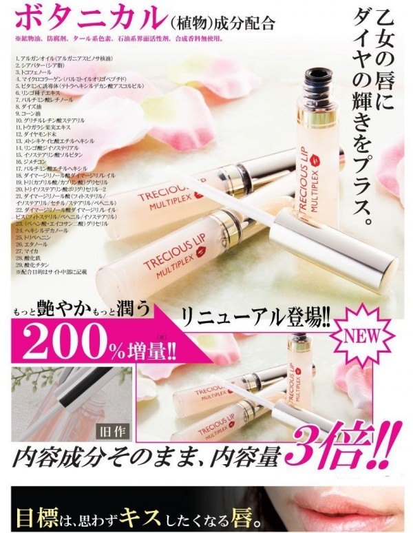 | 成分 | ダイマージリノール酸ダイマージリノレイル、トリ(カプリル酸/カプリン酸)グリセリル、トリイソステアリン酸ポリグリセリル-2、ダイマージリノール酸(フィトステリル/イソステアリル/セチル/ステアリル/ベヘニル)、ダイマージリノール酸ダイマージリノレイルビス(ベヘニル/イソステアリル/フィトステリル)、(ベヘン酸/エイコサンニ酸)グリセリル、イソステアリン酸ソルビタン、ヘキシルデカノール、パルミトイルオリゴペプチド、リンゴ種子エキス、グリチルレチン酸ステアリル、シア脂、アルガニアスピノサ核油、ダイズ油、コーン油、パルミチン酸エチルヘキシル、トリペヘニン、トウガラシ果実エキス、テトラヘキシルデカン酸アスコルビル、トコフェノール、パルミチン酸レチノール、エタノール、メトキシケイヒ酸エチルヘキシル、ダイヤモンド末、リンゴ酸ジイソステアリル、ジメチコン、マイカ、酸化鉄、酸化チタン |