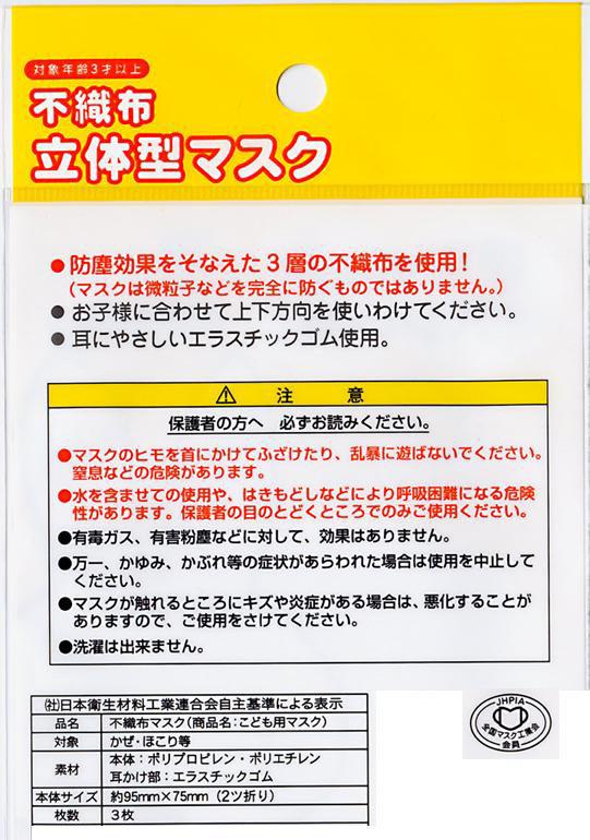 | 仕様 | 対象年齢3歳以上、防塵フィルター・静電フィルター、3層構造(1層/ポリエステル・ポリエチレン 2層/ポリプロピレン 3層/ポリプロピレン)(花粉除去99%・BFE99%) |