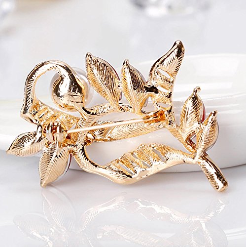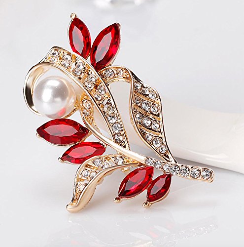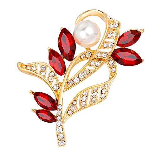 This captivating brooch pin features a Flower and leaf design with simulated Pearl accented with sparkly red and clear crystal accents. Wear this to shine up your evening dress, sash, sleeve, or wrap. Brooch measures approximately 1.75 inches wide and 2 inches tall. This beauty will be a great gift for your loved one.Feature