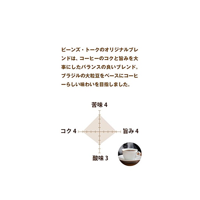 빈즈 토크의 오리지날 블렌드는,커피의 맛이 좋다는 느낌을 소중히 했 누르기 쉬어 밸런스가 좋은 블렌드.브라질의 대입콩을 베이스로 커피다운(풍미)맛을 지향했습니다.