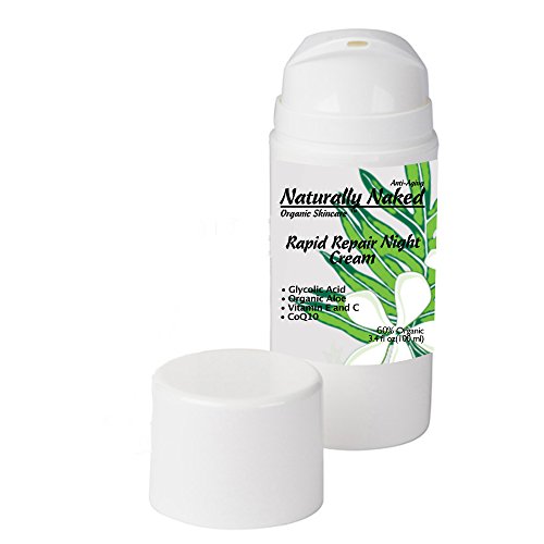 -. Feature : PREMIUM BENEFITS - Rapid Repair Night Cream offers effective hydration to help diminish wrinkles, fine lines, age spots and uneven skin. With ingredients like Glycolic Acid, CoQ10, Organic Green Tea and Vitamin E this cream helps remove the signs of aging and to enhance your youthful glow by morning. / OUR DEEP PENETRATING fruit based Alpha Hydroxy cream helps the other ingredients like CoQ10, Organic Green Tea and Vitamin E to nourish and hydrate the skin. Our deep penetrating fruit based Alpha Hydroxy cream will soften skin as old layers are sloughed away and new ones are brought to the surface, use for younger and smoother skin by morning. / RESTORE, REPAIR AND HYDRATE, with Naturally Naked's Rapid Repair Night Cream. With just one use you will see and feel the difference, skin will be softer, smoother and plumper. / GREAT FOR ALL SKIN CARE REGIMENS - This highly intensive moisturizing cream is perfect for anyone in dryer climates or has dry/mature skin. / Large 3.4 oz (100 ml) Bottle, large enough to last a couple of months but small enough to carry on an airplane. 60% Organic. Kosher Certified Materials.