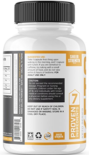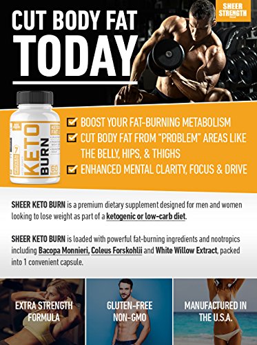 -. Binding : Health and Beauty -. Brand : Sheer Strength Labs -. EAN : 0850009007469 -. Feature : Sheer Keto BURN is an Extra Strength Ketogenic Fat Burner and Nootropic Supplement for Women and Men / HOW IT WORKS: Promotes Healthy Weight Loss, Mental Focus and Clarity with a Low-Carb or Keto Diet / Formulated with Powerful Ingredients Including L Theanine, Bacopa Monnieri, White Willow, and More / FOR BEST FAT-BURNING RESULTS: Take 1 Capsule With Breakfast and 1 Capsule With Lunch. / SAFE & EFFECTIVE - Made in The U.S.A. in an FDA-Registered Facility for Optimal Purity and Potency -. IsAdultProduct : 0 -. Label : Sheer Strength Labs -. Manufacturer : Sheer Strength Labs -. ProductGroup : Health and Beauty -. ProductTypeName : HEALTH_PERSONAL_CARE -. Publisher : Sheer Strength Labs -. Studio : Sheer Strength Labs -. Title : Extra Strength Ketogenic Fat Burner and Nootropic Supplement - Supports Healthy Weight Loss, Mental Focus & Clarity - L Theanine, Bacopa Monnieri & More - 60 Ct. - Sheer Strength Labs -. UPC : 850009007469