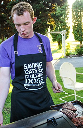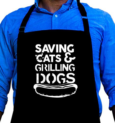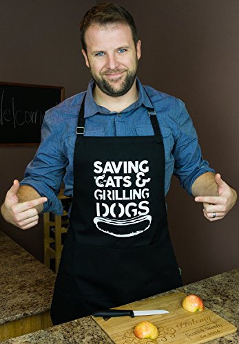 BBQ Grill Apron - Saving Cats & Grilling Dogs - Funny Apron For Dad - 1 Size Fits All Chef Apron High Quality Poly/Cotton 4 Utility Pockets, Adjustable Neck and Extra Long Waist Ties - Hot Dog