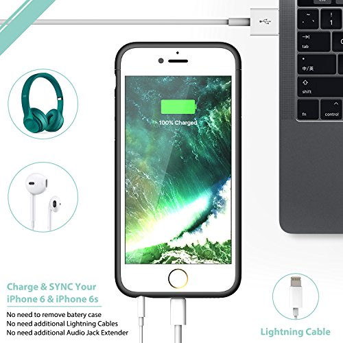 EASY TO USE:No excessive bulk, just feel free to use your headphone without audio jack extender.Ligthing cable input,then you can charge your battery case and iPhone 6/6s simultaneously with your existing iPhone lightning cable.