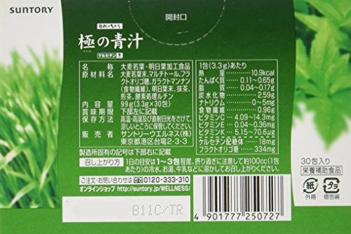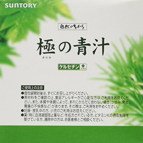 Product Name: green juice 30 capsule containing Contents of Suntory poles: 30 capsule containing / about 10 to 30 days ※ 1 day 1 to 3 follicles guideline Ingredients: young barley powder maltitol galactomannan (dietary fiber) tomorrow Hazue green tea Sencha xylooligosaccharide enzyme-treated rutin nutritional ingredients: 1 package (3.3g) per quercetin glycosides / 18mg dietary fiber /0.58~1.11g vitamin C / 1.00 ~ 17.0mg vitamin E / 0.10 ~ 0.50mg amount of heat / 8.5 ~ 13.0kcal protein /0.18~0.66g lipid /0.06~0.16g carbohydrate /2.00~3.10g sodium / 0 ~ 16mg potassium / about 40mg phosphorus / 10mg less than vitamin K / about 50μg caffeine / 10mg less than Notes: ● number after the pack is opened immediately enjoy. ● Check on the raw materials better food allergy is your concern please do not use. In addition by the constitution and physical condition rarely if you do not fit in the body (itching rash such as gastrointestinal discomfort) there is. In that case please discontinue use. ● If you are pregnant or nursing please refrain from the use of children. ● If you are prescribed a medicine the person in hospital please consult with your doctor. ● diet the staple food main dishes side dishes based on the balance of the meal. ● We use natural products that it may be a different color and taste due to the timing of the harvest. ● referring to the recommended dose of 1 day please use with care so as not to too take.