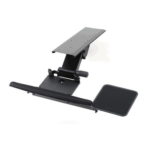 -. Feature : Composed of keyboard clamp, mouse tray (right or left hand) and wrist rest; Keyboard tray for all keyboard style; steel frame coated black; dimensions: 19.2" (L) x 5.3" - 9.4" (W) / Arm tilting angles: 25° up/40° down; Keyboard platform tilting angles 19°/ mouse tray rotation: 360°; Height adjustment: 5.9" (150mm); Loading area depth: 4.9"-7.5" (125-190mm) (distance from bottom surface of desk to this unit after being installed) / Control and use your keyboard tray unit in easy ways; Spring mechanism enables instant height adjustments with no need of lever; Meterials: solid steel & foam