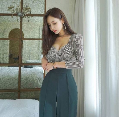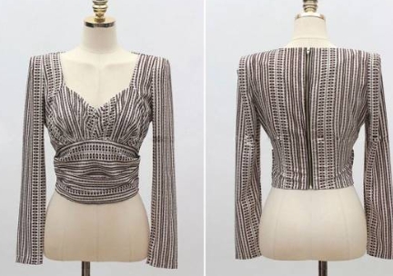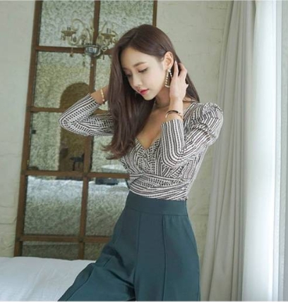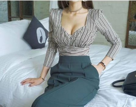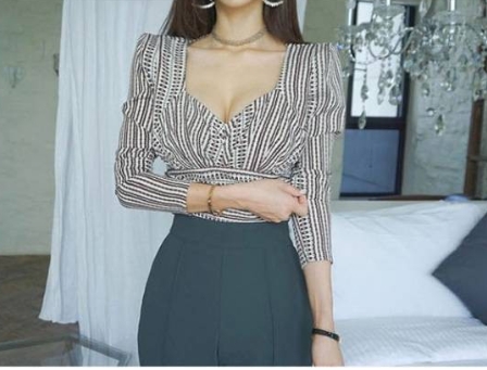 胸元のカッティングがセクシーな、ストライプの七分袖ブラウスです。