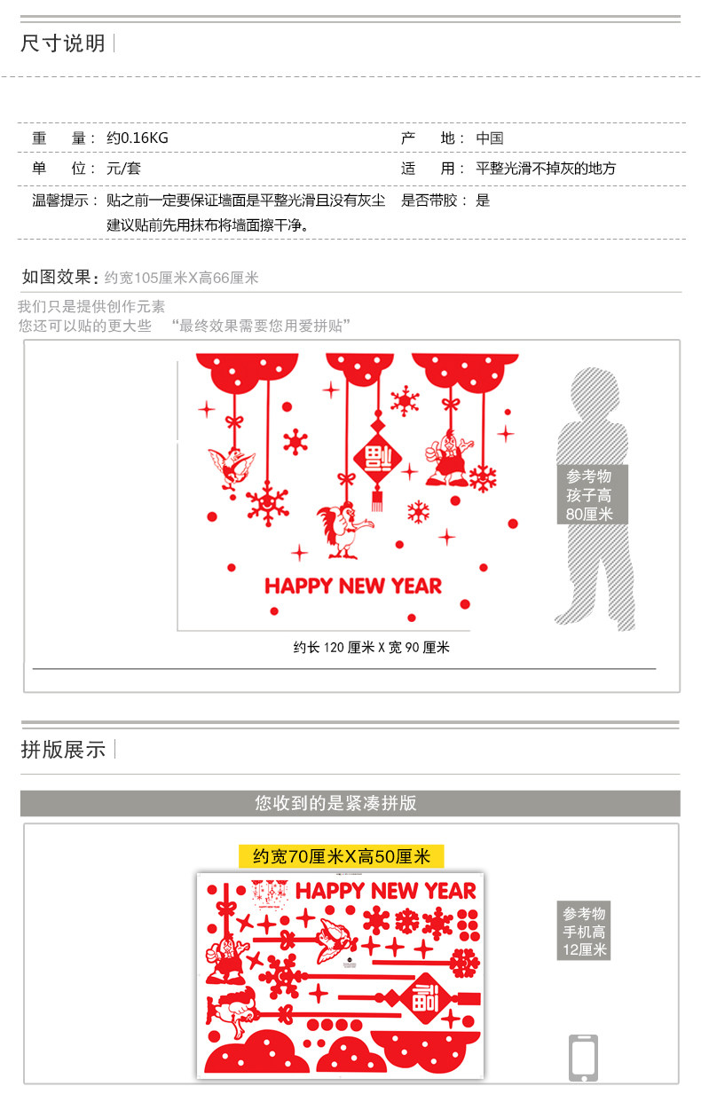 E. Window glass removable stickers Chinese New Year festive New Year decoration New Year blessing word wall stickers 2017 Year of the Rooster