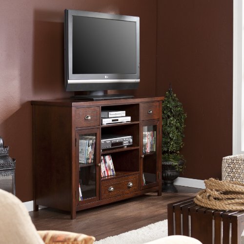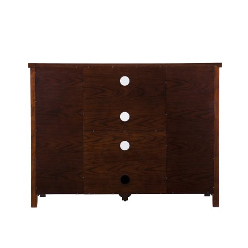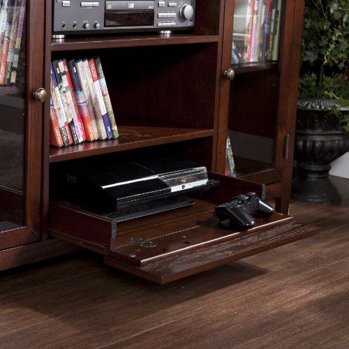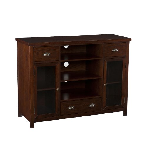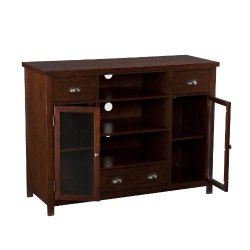 This media console utilizes three large open shelves in the middle above one large drawer to fit electronics and media equipment. There are window pane cabinet doors on either side housing one adjustable shelf each. The doors of the cabinets have glass windows to allow you to easily locate the equipment you need. The storage capacity in this media console is extraordinary, making it capable of holding a wide range of movies, games and gaming equipment. With so much space and a rich espresso finish, it is sure to bring form and function into your home. The handcrafted touch of artisan skill creates variations in color, size and design. If buying two of the same item, slight differences should be expected. Note: color discrepancies may occur between this product and your computer screen. This item accommodates a flat panel TV up to 52" overall and has three cord management holes, one per center shelf. Dimensions include: Overall: 48" W x 18" D x 36" H; Top drawers - 10" W x 13.25" D x 5.25" H (interior); Bottom, hinged drawer - 18" W x 12.5" D x 2.25" H (interior), 18" W x 17.5" D x 2.25" H (open); Window pane cabinets - 12" W x 17.25" D x 23.75" H (interior); Top center shelf - 20" W x 17.25" D x 6.75" H (stationary); Middle center shelf - 20" W x 17.25" D x 8.25" H (stationary); Bottom center shelf - 20" W x 17.25" D x 8.25" H (stationary). This one-of-a-kind item approximately weighs 140 pounds and supports up to: 175 lb. (top), 10 lb. (each drawer), 30 lb. (each center shelf), 25 lb. (each side shelf), 15 lb. (pull-out tray). Only quality materials and manufacturing will do. Product materials include: Materials: hardwoods, veneers, MDF, 5mm tempered glass. Assembly: Required. Made in China.Feature