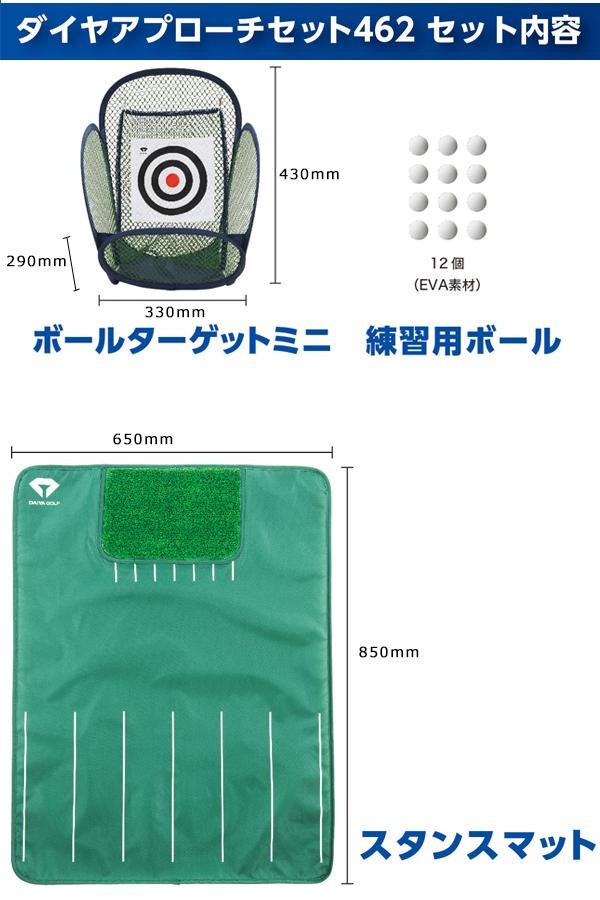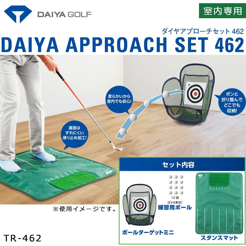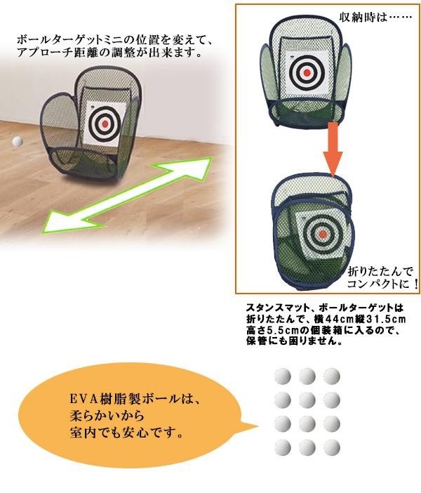 自宅で簡単にスタンスを確認しながらアプローチを練習できます。室内でも安心な柔らかい練習用ボール付きです。 |