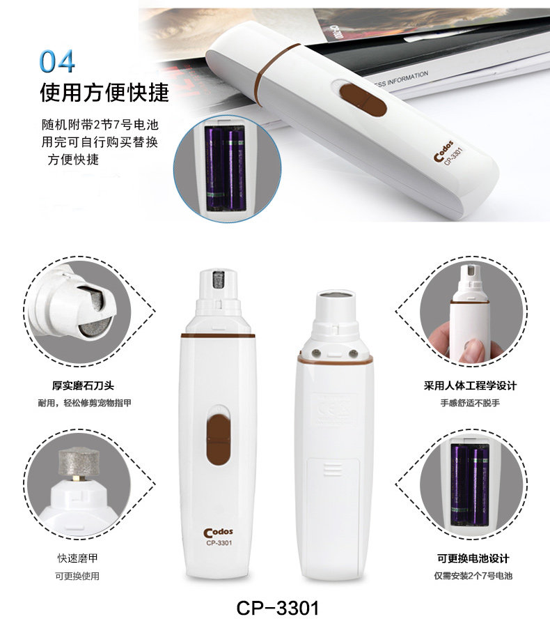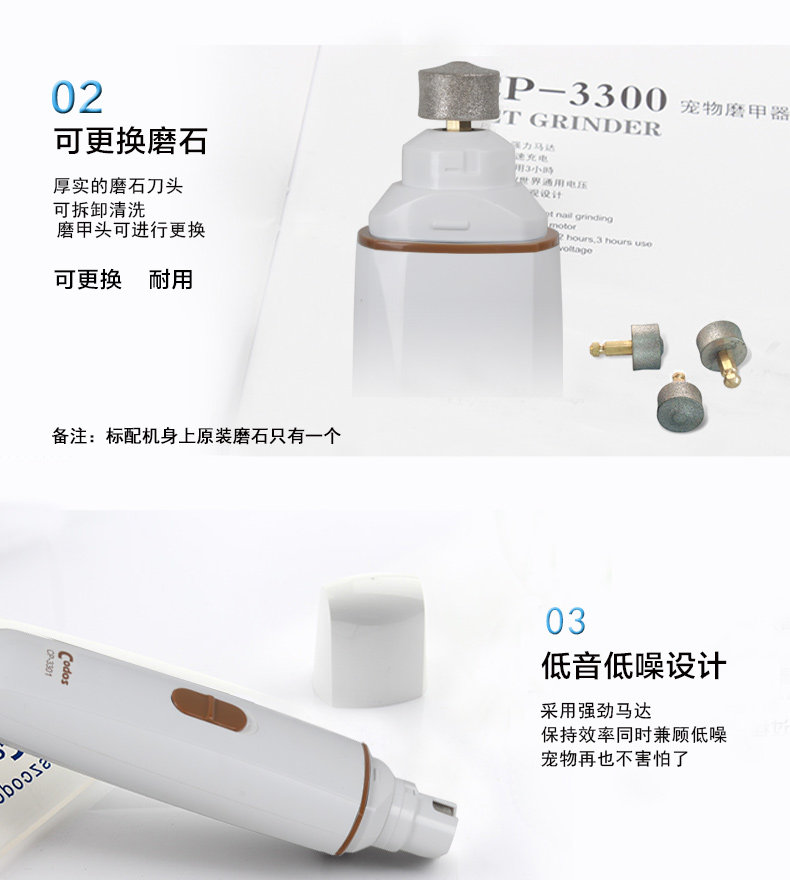 1.Low Vibration and Low Noise - This Pet Nail Grinder is equipped with super mute motor but powerful. It gently removes thin layers of nail with low noise and low vibration, so that sensitive pets will be happy with this nail grinder, making your nail trimming work easier.