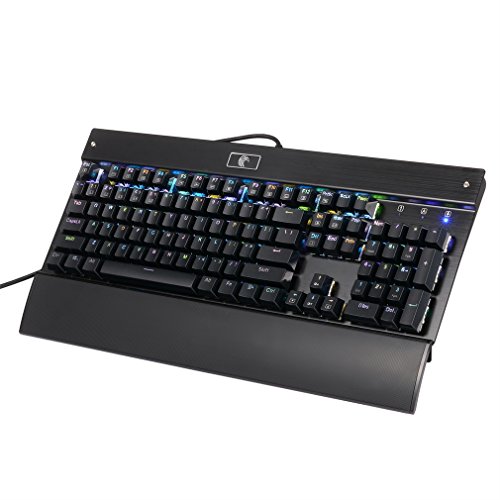-. Feature : ★Anti-ghosting 104 Keys: N-key rollover. Allowing multi-keys to work simultaneously with high speed. Each key is controlled by independent switch, let you enjoy high-grade games with fast response.No Driver Needed / ★DIY Gaote/Outemu Blue Switches:Garte mechanical Blue switches designed for longevity, responsiveness, and durability. Mechanical keys with medium resistance, audible click sound, and tactile feedback. 50 million times keystroke test, 60±15 grams keystroke force and 4.0±0.2mm keystroke travel. / ★Backlighting and Color-Flashing:9 modes RGB Backlighting with 5 grade Brightness and Color-Flashing Speed. Double-shot injection molded keycaps for crystal clear backlighting. / ★LED Color Customized and Shortcuts Key: Press FN+"Home" to set color of each key with no driver needed; Press FN+ "F1~F12" to control multi-media function calculator, email, web browser, volume, media etc. / ★Ergonomical Design: The stepped keycap makes it sleek and slope, with demountable Wrist rest fit for your hands easily to prevent fatigue.