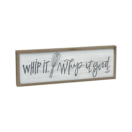 - Distressed and weathered white wash style sign with gray text that reads "Whip It Whip It Good" in a fresh font style with graphic of a whisk.