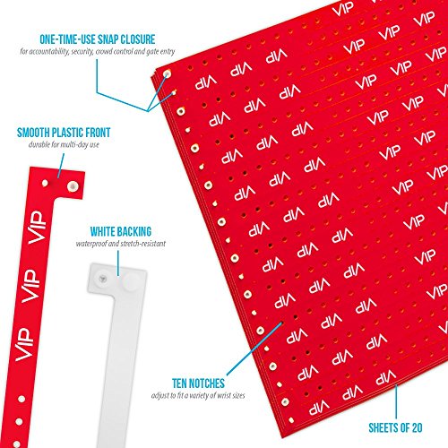 -. Feature : Comfortable & Light Weight / Secure, one time use, locking plastic snaps / Waterproof / Excellent for extended wear / 500 Wristbands in Sheets of 20.
